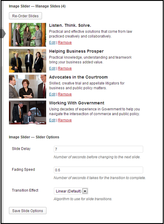 Re-ordering your homepage sliders is as easy as dragging and dropping into place! You can also control the speed & transition effect between sliders (below).