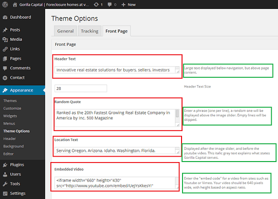 The next screenshot shows Gorilla Capital’s website dashboard. You’ll see the tool we built. Things circled in red show where they update text, and things circled in green show how we provide helpful tips to remind them how the system works.
